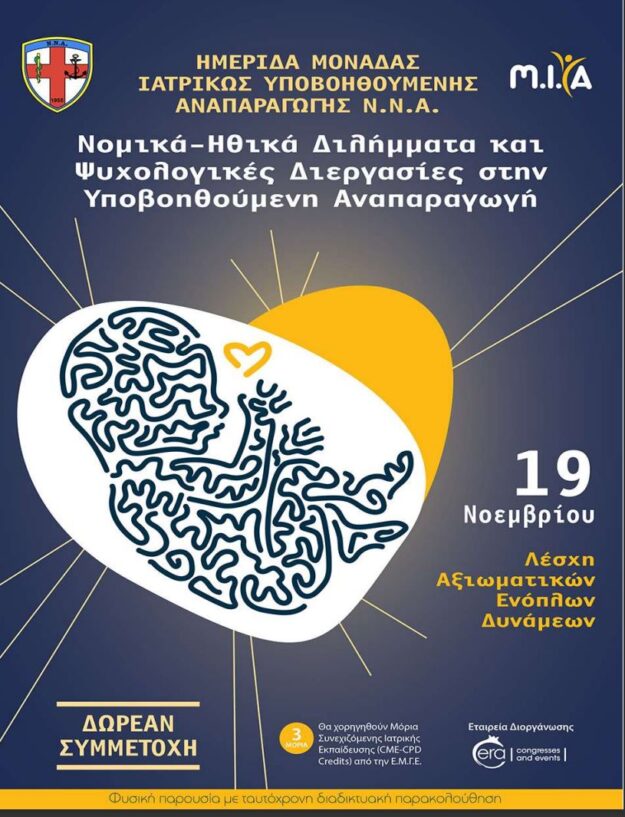 Αποτελεί εξαιρετική τιμή να σας προσκαλέσουμε στην Ημερίδα, που διοργανώνει η Μονάδα Ιατρικώς Υποβοηθούμενης Αναπαραγωγής του Ναυτικού Νοσοκομείου Αθηνών με θέμα «Νομικά – Ηθικά Διλήμματα και ψυχολογικές διεργασίες στην Υποβοηθούμενη Αναπαραγωγή», την Παρασκευή 19 Νοεμβρίου 2021.