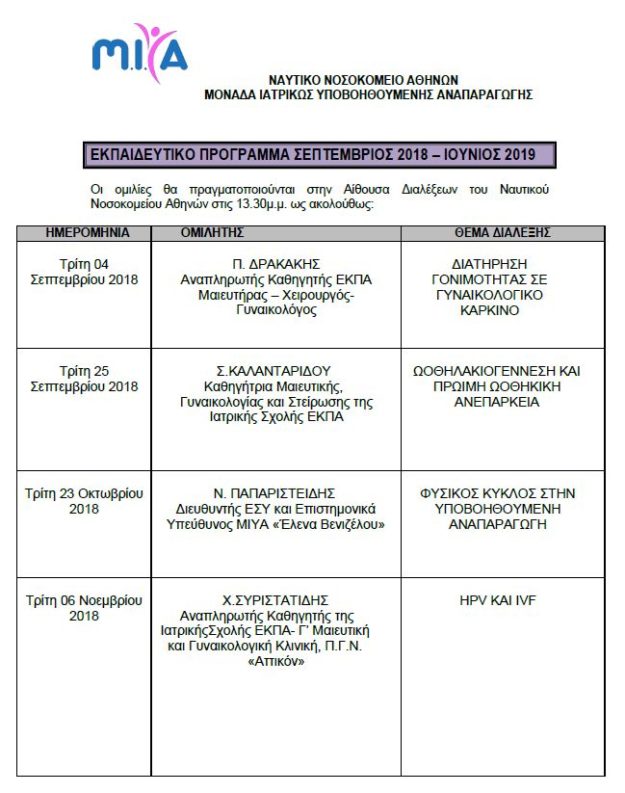 Την Τρίτη 27 Νοεμβρίου 2018, στα πλαίσια του Εκπαιδευτικού Προγράμματος Σεπτεμβρίου 2018 – Ιουνίου 2019, πραγματοποιήθηκε διάλεξη με θέμα Παχυσαρχία και Υποβοηθούμενη Αναπαραγωγή στην Αίθουσα Διαλέξεων του Ναυτικού Νοσοκομείου Αθηνών με κεντρικό ομιλήτη τον Κο Γ. ΑΝΤΩΝΑΚΗ (Καθηγήτης Παιδιατρικής Μαιευτικής και Γυναικολογίας ΕΚΠΑ).