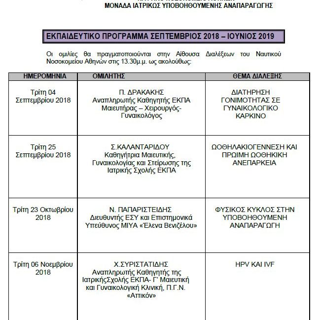 DetailsΤην Τρίτη 02 Οκτωβρίου 2018, στα πλαίσια του Εκπαιδευτικού Προγράμματος Σεπτεμβρίου 2018 – Ιουνίου 2019, πραγματοποιήθηκε διάλεξη με θέμα Ωοθηλακιογέννεση και Πρώιμη Ωοθηκική Ανεπάρκεια